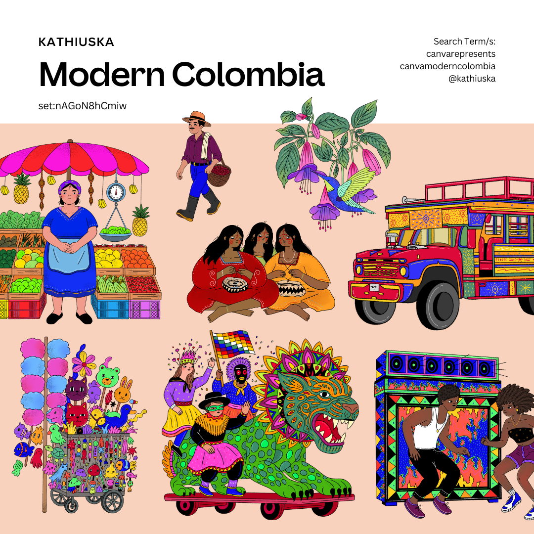 I was invited by Canva to create an illustration collection for their library, celebrating Colombia’s rich culture through an exploratory journey of its iconic places, urban life, street art, food, and everyday experiences.